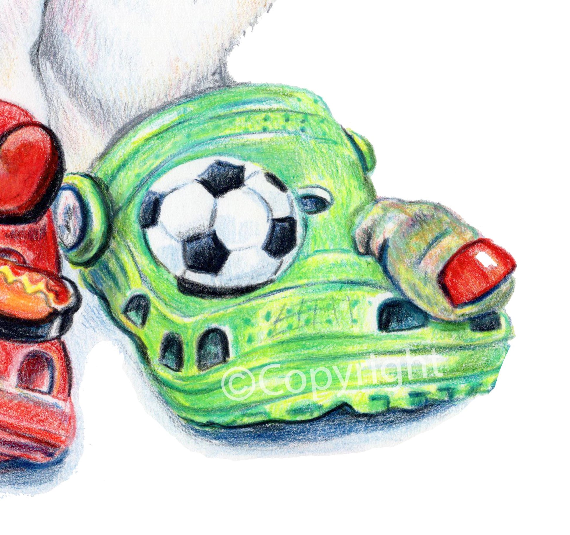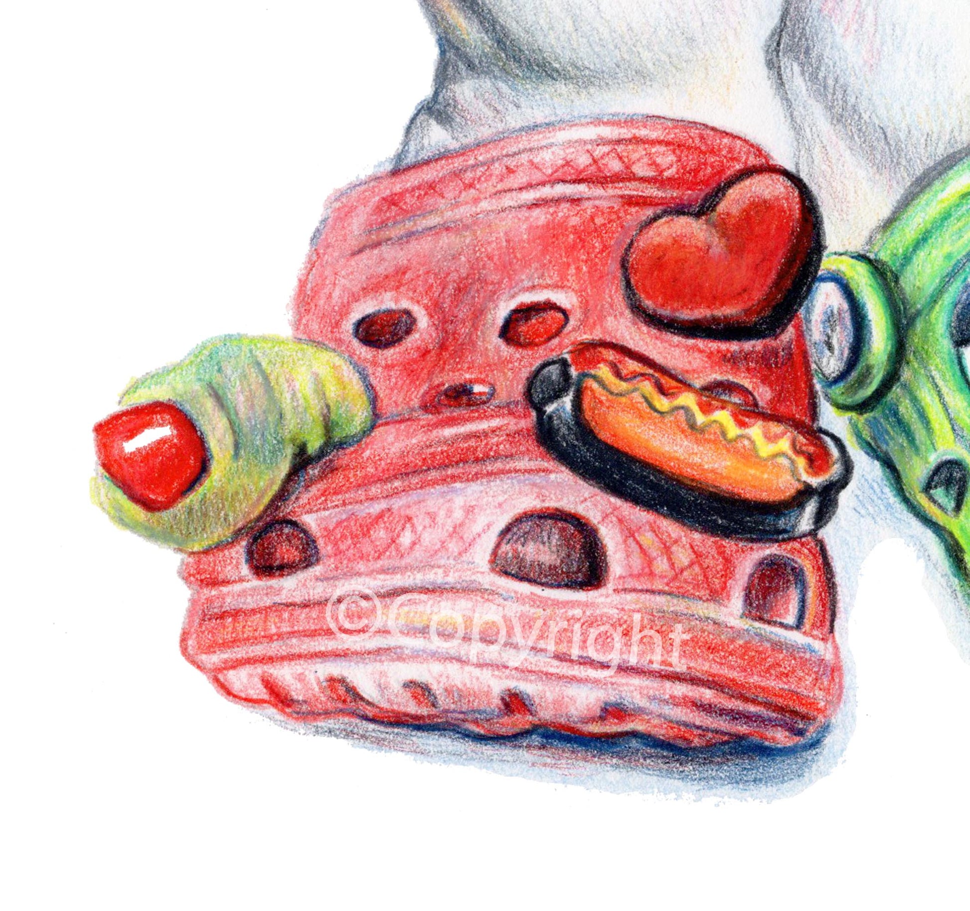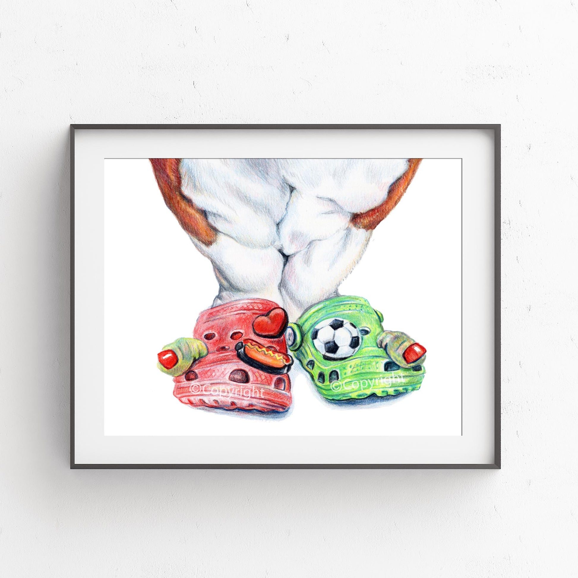 This is a PRINT of my original coloured pencil drawing of a Basset hound dog wearing those famous ugly, rubber slipper shoes. He chose all of his charms personally.