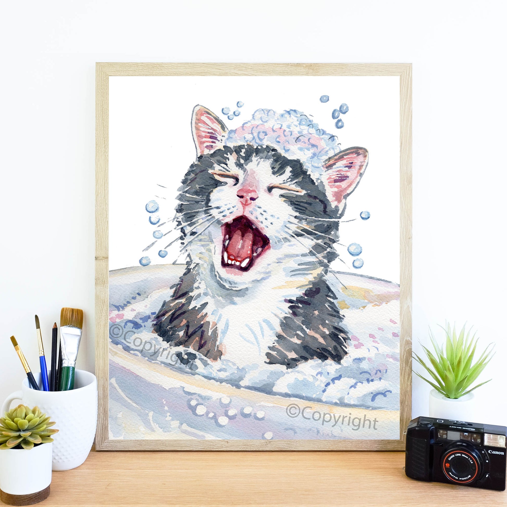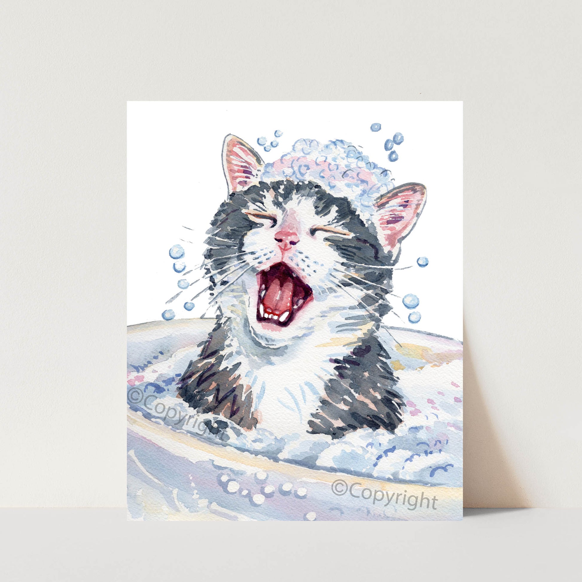 This is a PRINT of my original watercolour painting of a grey and white tabby cat singing while taking a bubble bath. The lovely model for this illustration is my very own cat Mitzi.
