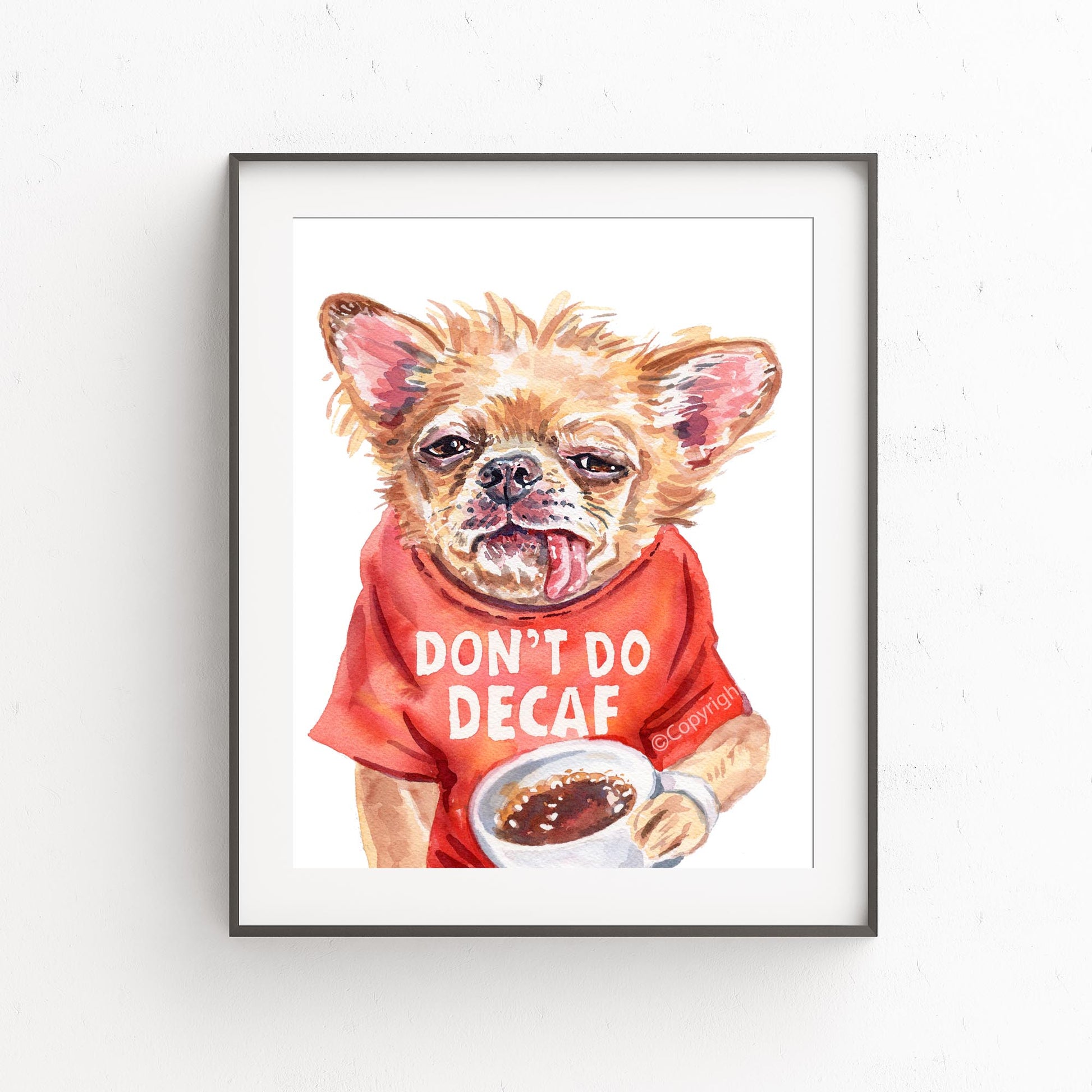This is a PRINT of my original watercolour painting of chihuahua dog who tried decaf so you don't have to.