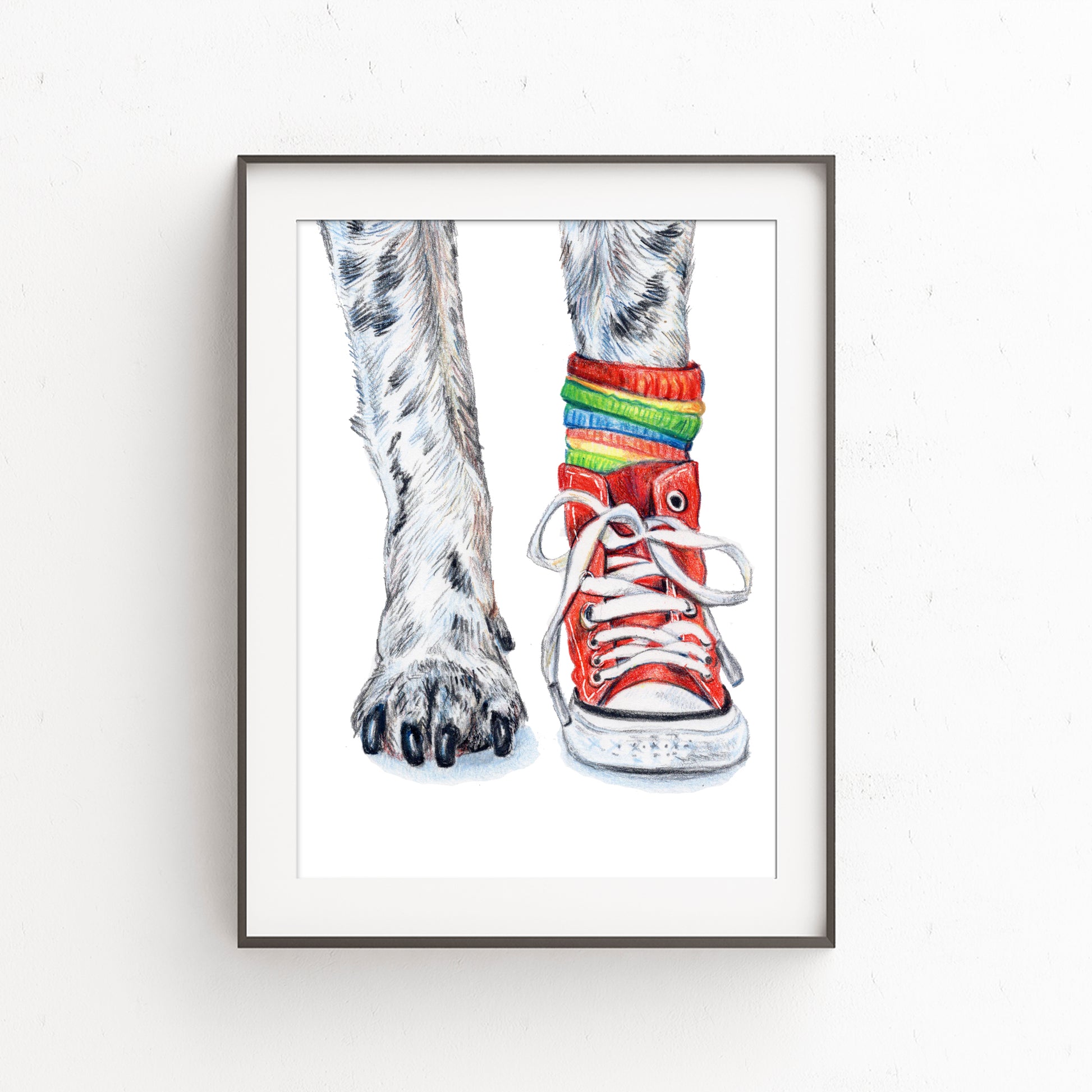 This is a print of my original coloured pencil drawing of a dog wearing one high top sneaker with a colourful sock. The dog who let me draw his sexy little legs is my very own Oreo.