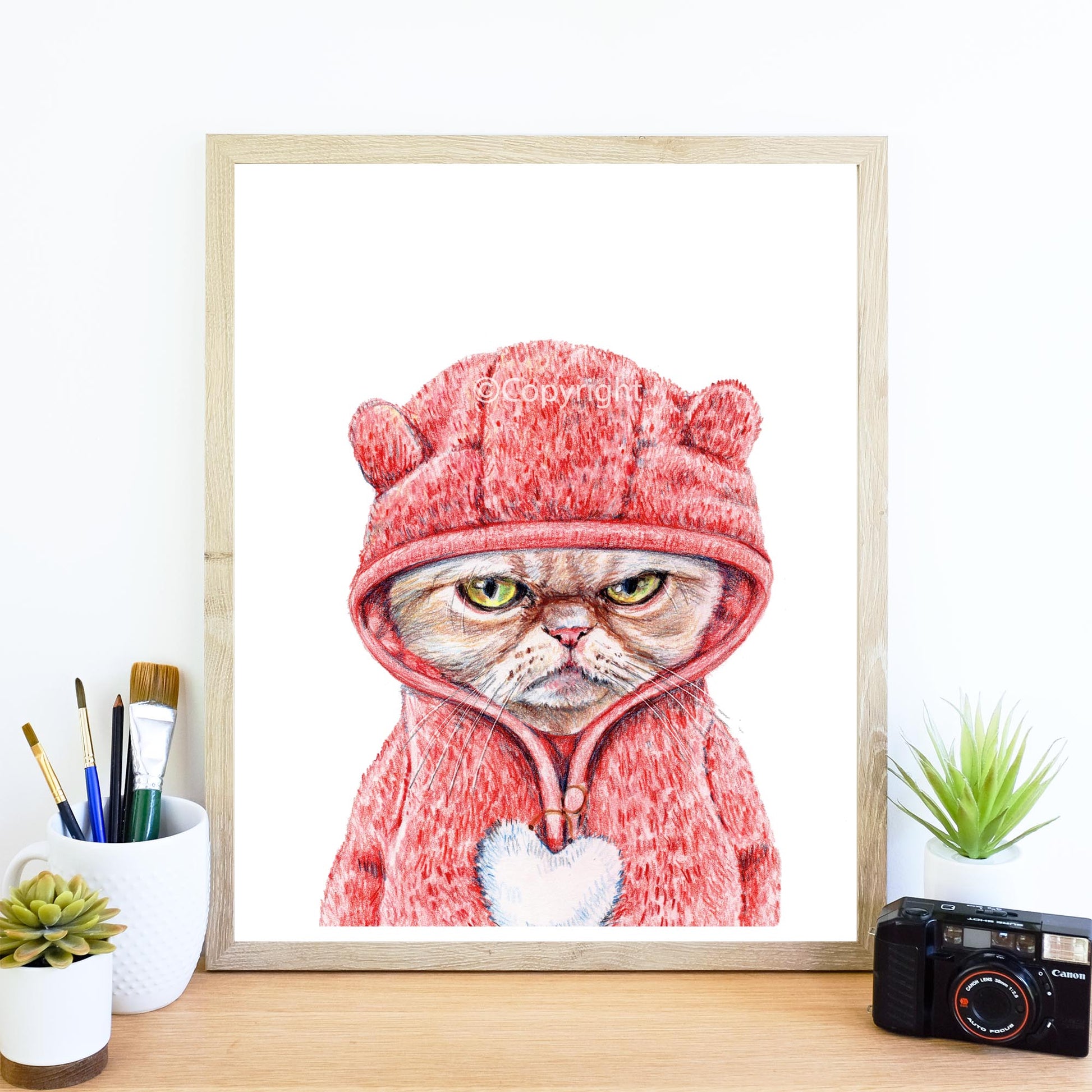 This is a print version of my original coloured pencil drawing of a grumpy cat wearing a pink hoodie with little bear ears.