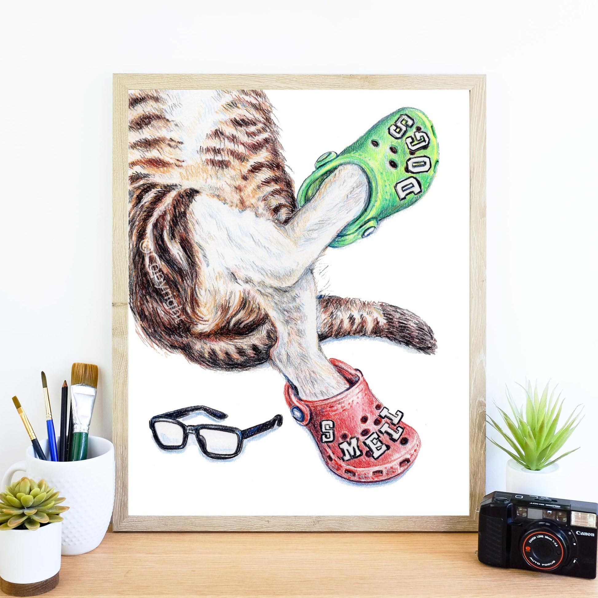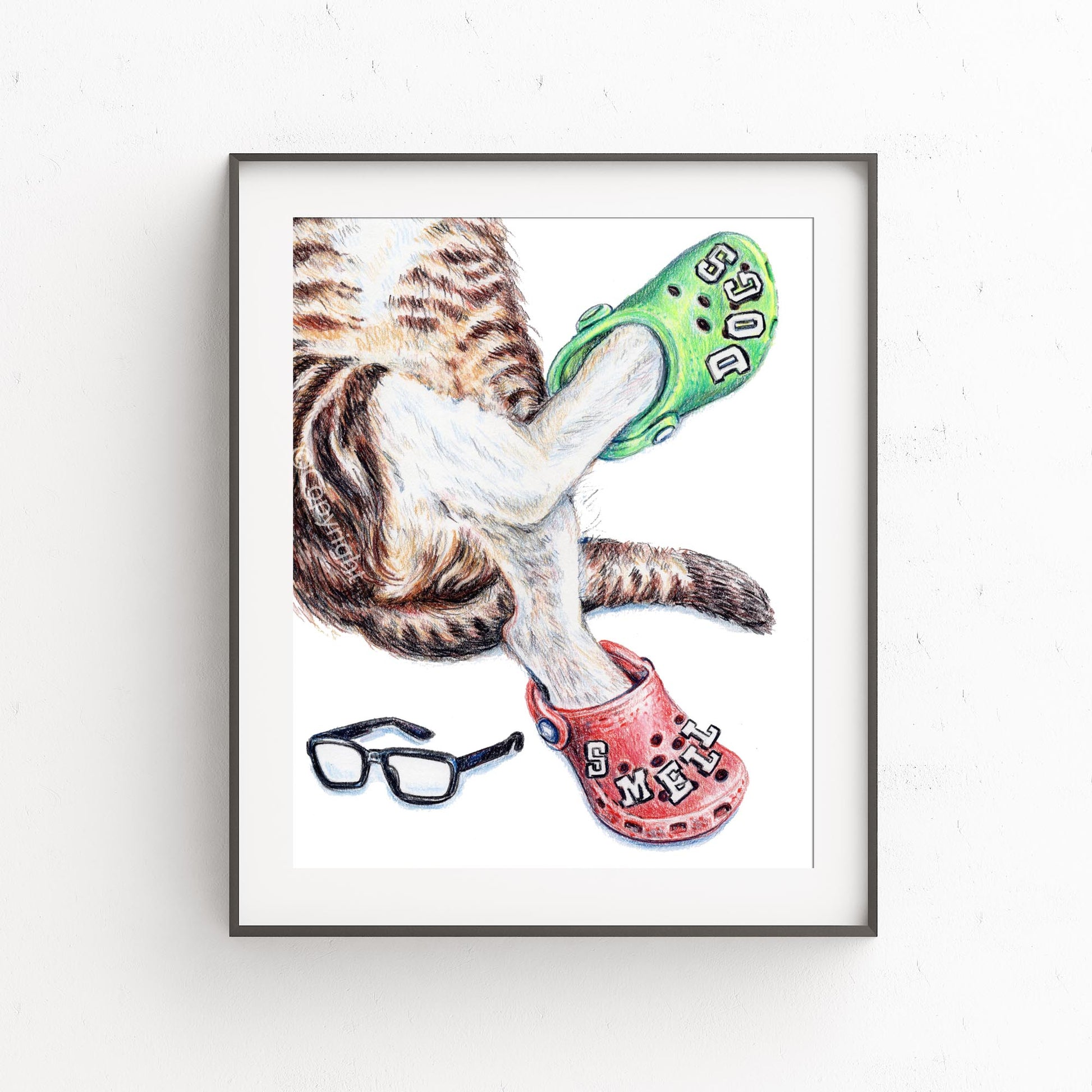 This is a print of my original drawing of a lounging tabby cat kitten wearing 2 different Croc shoes with giblets that spell out a secret message.