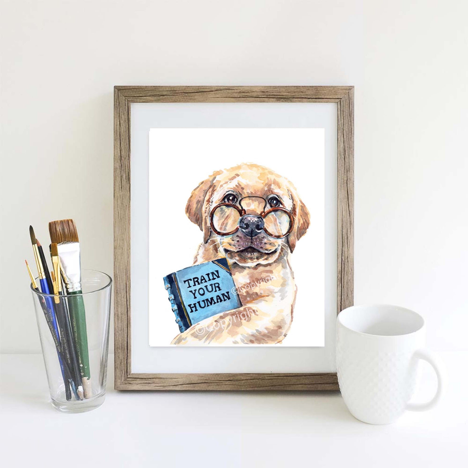 This is a print of my original watercolour painting of a yellow lab puppy studying a book about obedience training - for humans.
