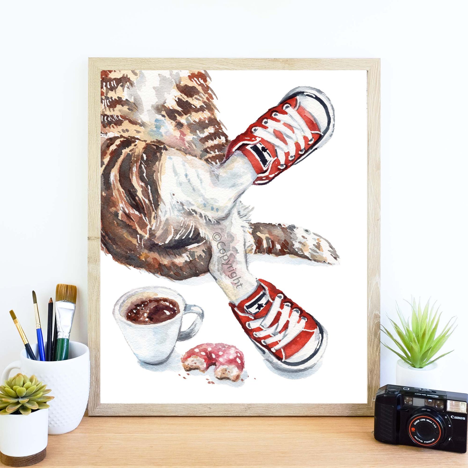 This is a PRINT of my original watercolour painting of a lounging tabby cat kitten who knows how to live the good life. Coffee, donuts and red sneakers are an essential part of that lifestyle.